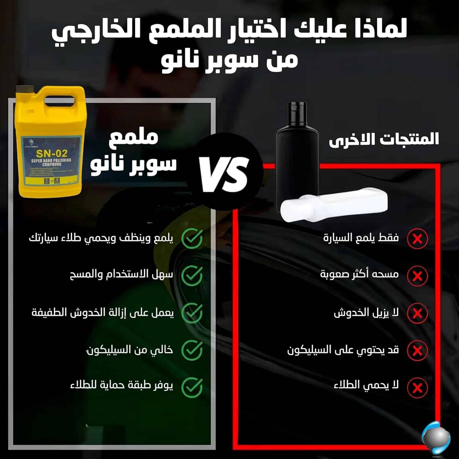 • تعمل تركيبة ملمع السيارات الخارجي من سوبر نانو على تلميع وتنظيف وحماية وتنعيم طلاء سيارتك بفعالية. هذه التركيبة المميزة تعيد اللمعان والبريق لطلاء سيارتك بأسرع وقت وأقل مجهود.
