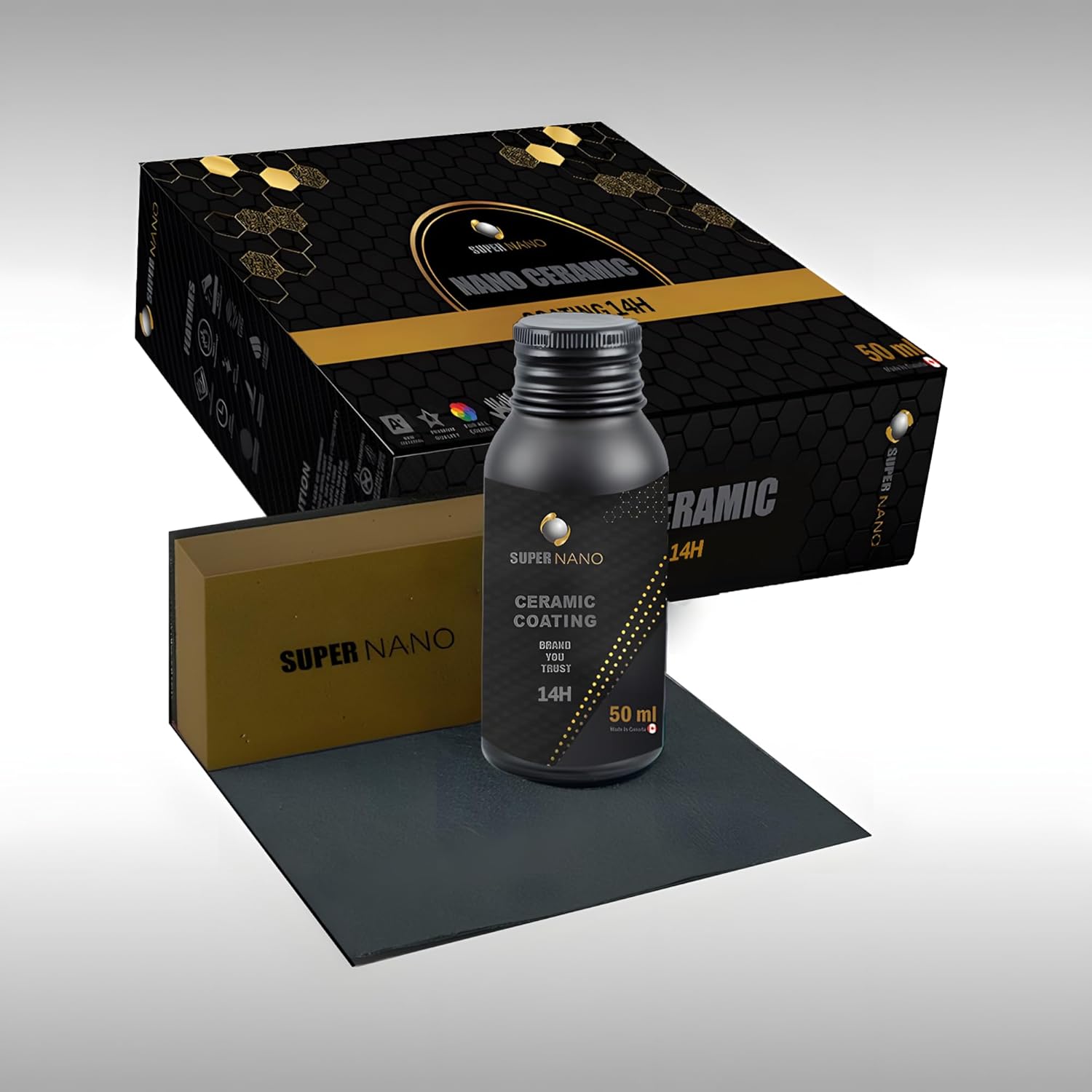 نانو سيراميك الكندي المتقدم 14H خارجي 50 ملم – طلاء حماية عالي الأداء يمنح سيارتك درعاً صلباً بصلادة 14H ولمعاناً زجاجياً فائقاً. مقاوم للخدوش، الأتربة، الأشعة فوق البنفسجية والعوامل الجوية القاسية. سهل التطبيق ويكفي لتغطية سيارة كاملة بطبقة احترافية تدوم لسنوات. مثالي للعناية الخارجية بالسيارات من متجر سوبر نانو.